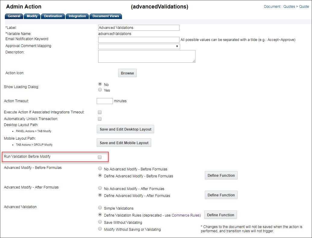 Access the appropriate Admin Action page to enable the Run Validation Before Modify option. The following image shows the new "Run Validation Before Modify" option for modify actions.
