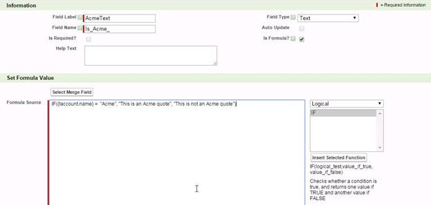 The above screen shot shows an example of how you can use IF logic to evaluate the account name and return two different text values depending on whether or not the account is "Acme."