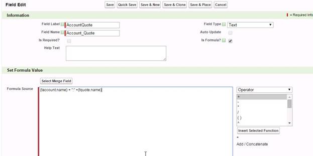 In the above screen shot example, the use of the Add/Concatenate operator between the account name and the quote name would render a field with the text "Acme:Quote01" if the account was Acme and the Quote was Quote01.