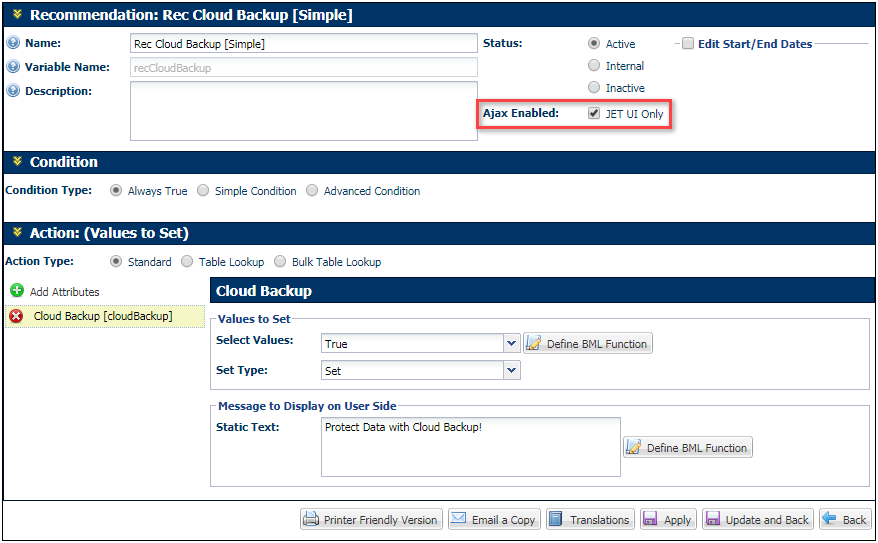 Navigate to the applicable Configuration Recommendation Rule and select the Ajax Enabled checkbox to enable AJAX functionality for JET Configuration UIs.