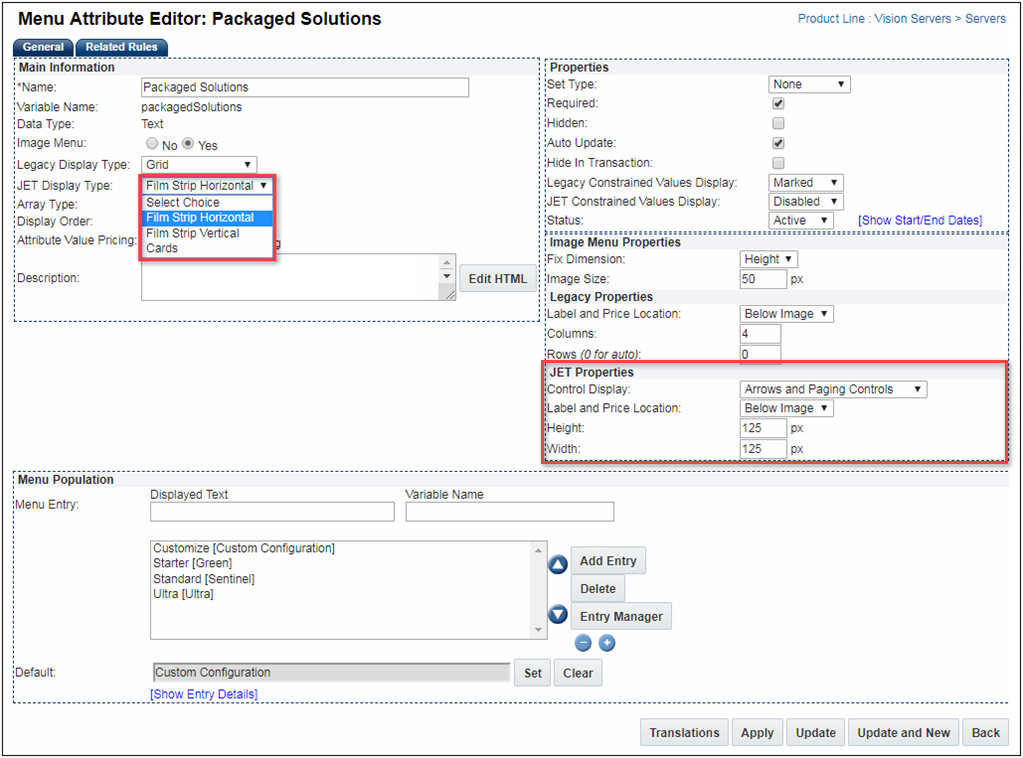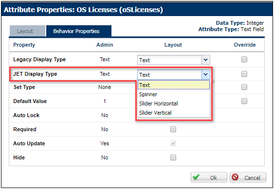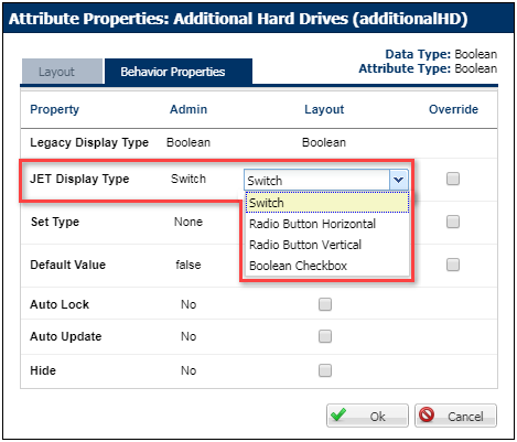 The JET Configuration provides new attribute display options for Boolean attributes, numeric attributes, and image menus.