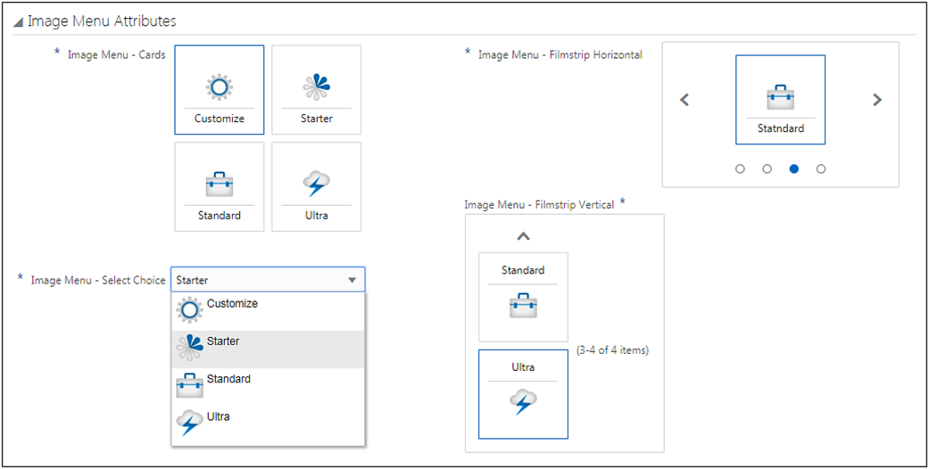 The JET Configuration UI supports all basic configuration features previously available in CPQ’s legacy Configuration UI: