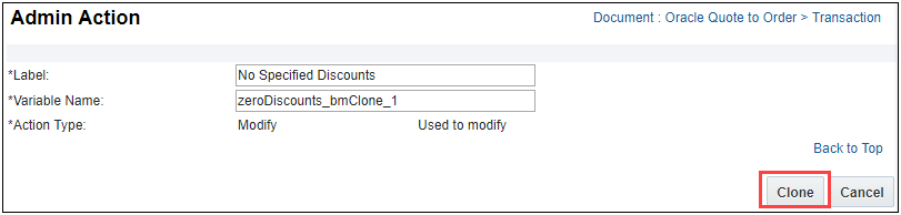 - Click Clone. The Admin Action page for the new cloned action displays.