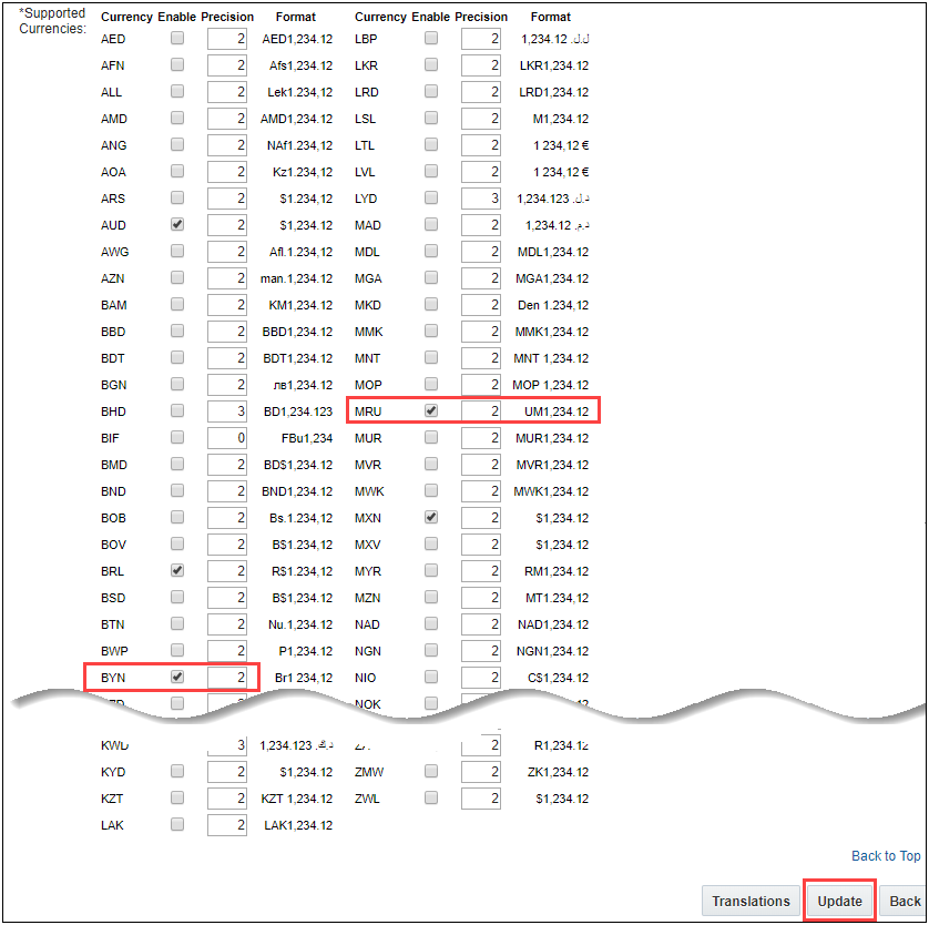 - Click to enable a currency from the Supported Currencies list.