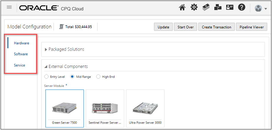 In CPQ Cloud, administrators can use tab components to show different groups of content within the Configuration UI. CPQ Cloud 19B allows administrators to display vertical tabs for the JET Configuration UI. Vertical tabs are arranged on the left side of a panel instead of on the top in horizontal space.