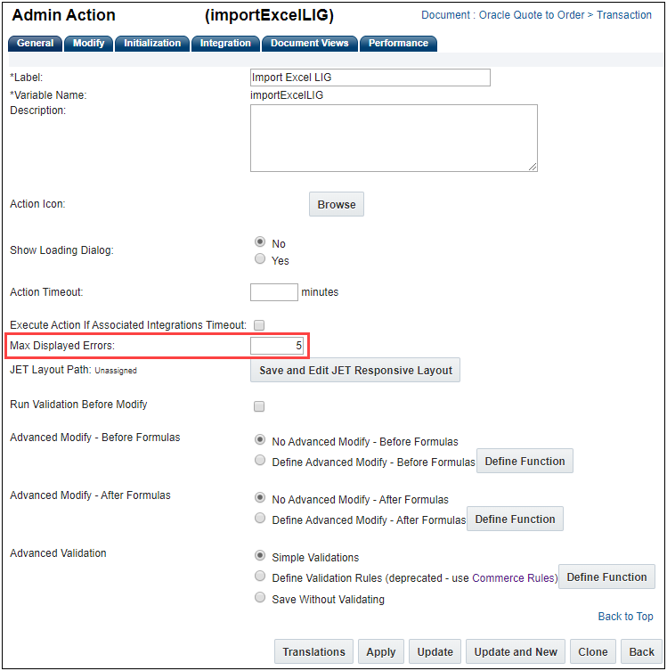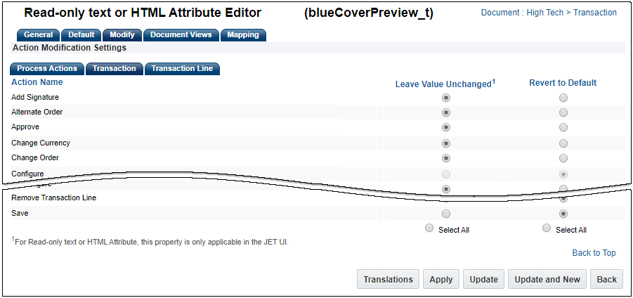 As this option was not available prior to 20B, existing HTML attributes will continue to be set to Revert to Default for all modify actions after the environment is upgraded to Oracle CPQ 20B. To take advantage of better page performance and to avoid migration issues, administrators must change this setting to Leave Value Unchanged for specific HTML attributes and modify actions. When the user clicks a specific action, this will eliminate the regeneration of the HTML attribute, resulting in better page performance.