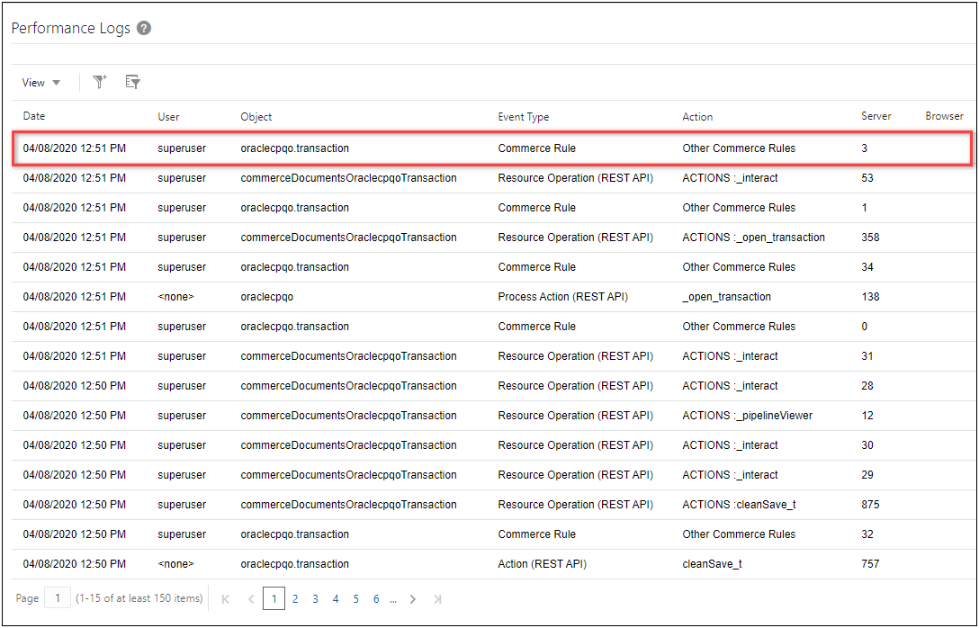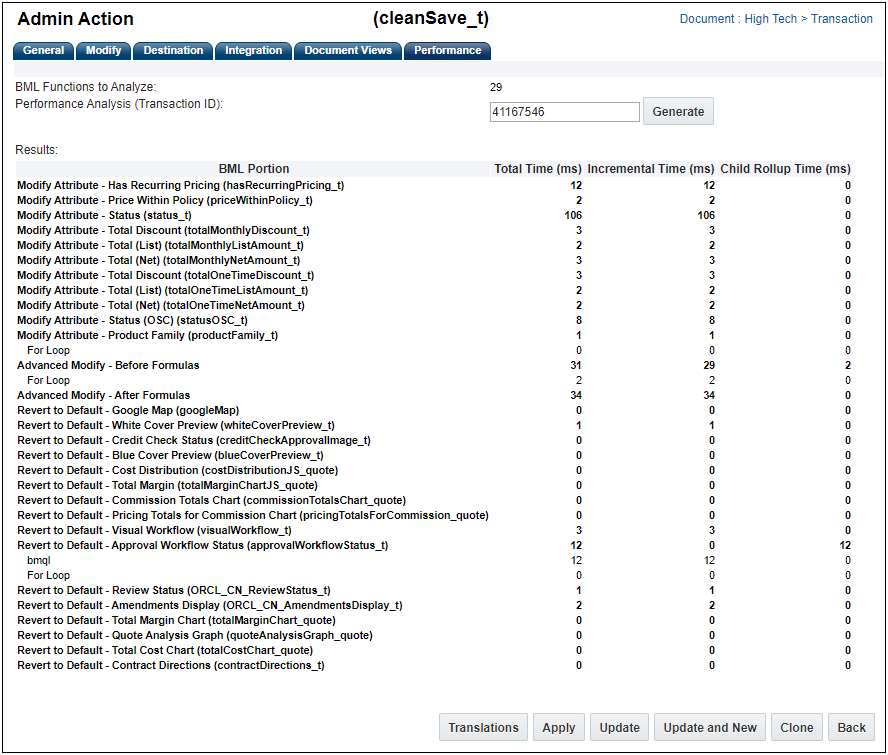 Commerce action performance analysis was introduced in Oracle CPQ 19A to help customers identify potential performance hindrances. Beginning in Oracle CPQ 20B, the performance analysis will include the run-time for the action's BML, including the library functions and select BML functions for the specified transaction or transaction line. The performance analysis shows elapsed time for processing-intensive elements of a Commerce action's BML. This feature allows the administrator to troubleshoot common performance complaints, such as "the system is slow when I save my quote". This feature can also be used to benchmark BML performance before and after implementing a script change.