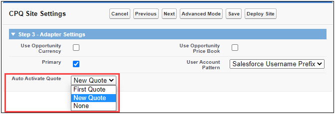 Oracle CPQ Connector for Salesforce Managed Package v8.6 allows administrators to define a site-level default setting for marking a quote within an Opportunity as active. This includes quotes that are newly created as well as those that are copied/cloned and moved from one Opportunity to another. The new Auto Activate Quote setting provides three options, as follows: