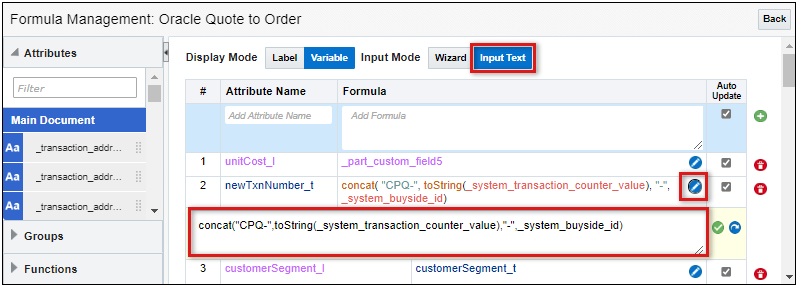 Beginning in Oracle CPQ 23A, CPQ provides an alternate input method to create formulas using plain text entry. The new formula entry method vastly increases ease of use and supports the following functionality:
