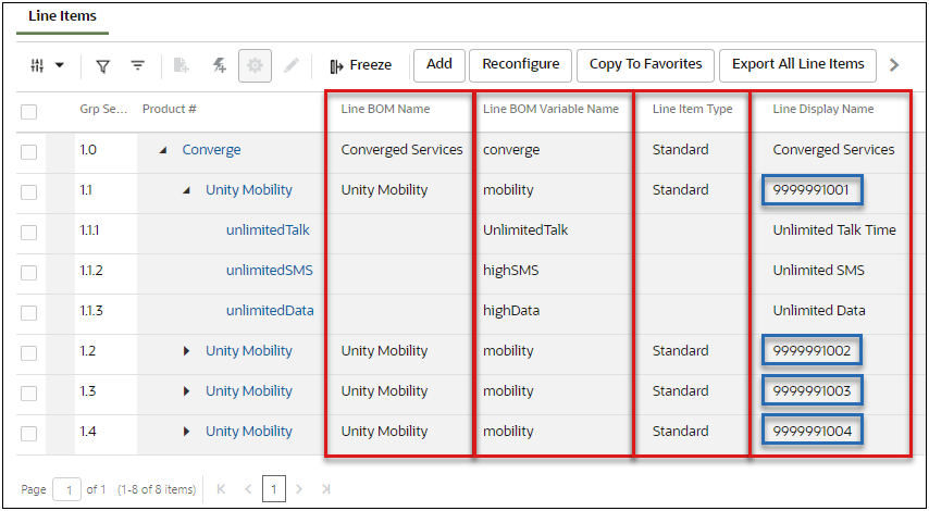When a sales user creates a transaction from the configuration shown above, the new BOM attributes are displayed in the Line Item Grid. The new BOM-related attributes are outlined in red in the image below. The Line Display Names outlined in blue are using the DISPLAY_NAME target value from the BOM Attribute mapping. The remaining Line Display Names are populated using the Name from the BOM Item Definition table.