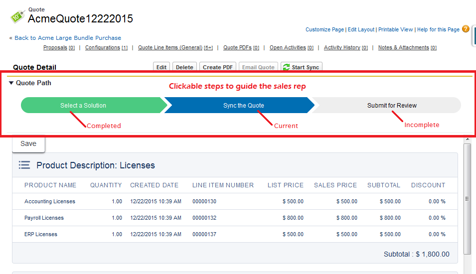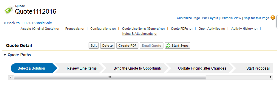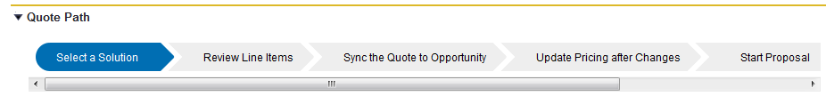The configuration of Quote Paths allows for a series of quote path steps to appear within the Quote Detail for a sales user to see.