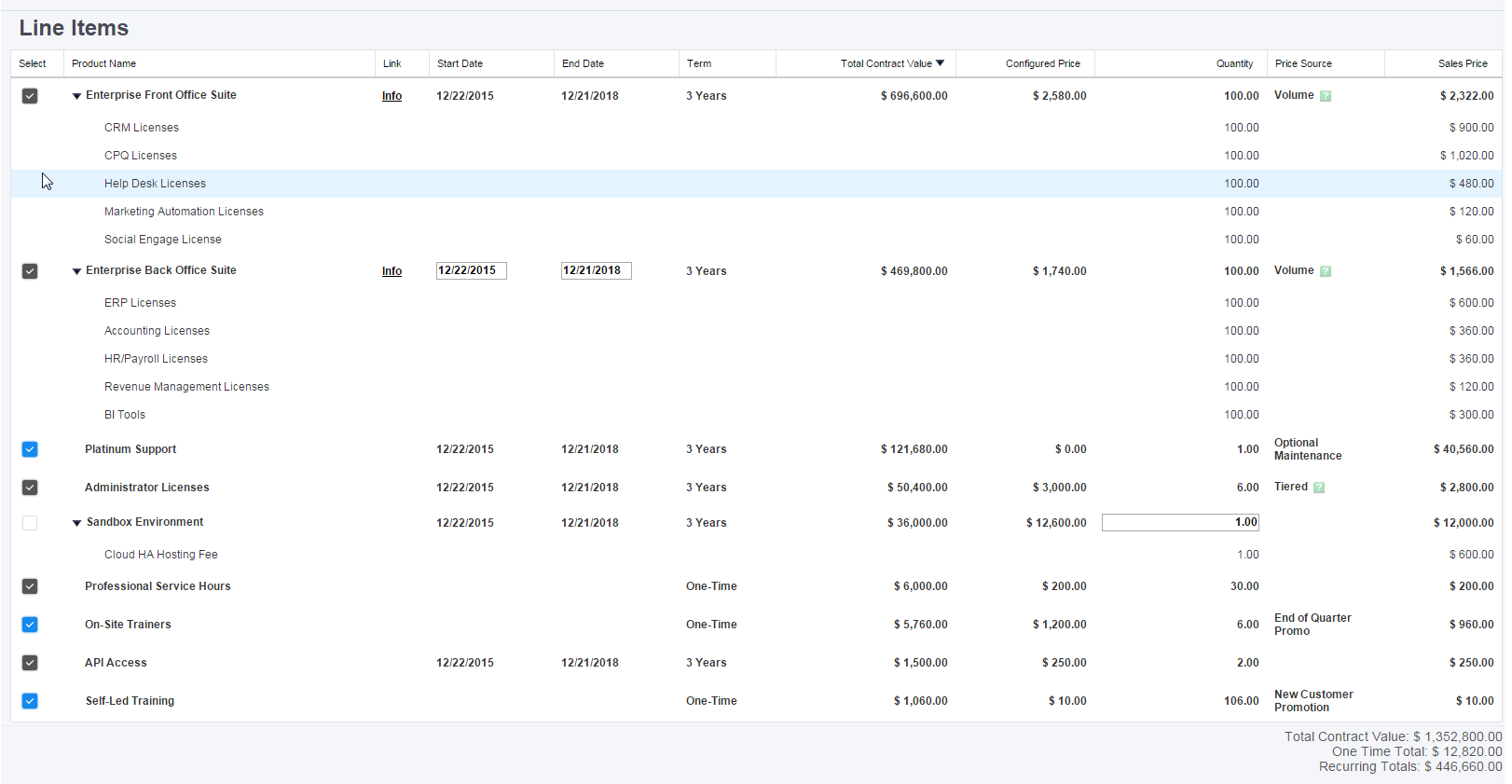 - For organizations with many products and complex product configurations, sales reps can use this feature to quickly locate and modify line items through grouping, sorting, and inline editing.