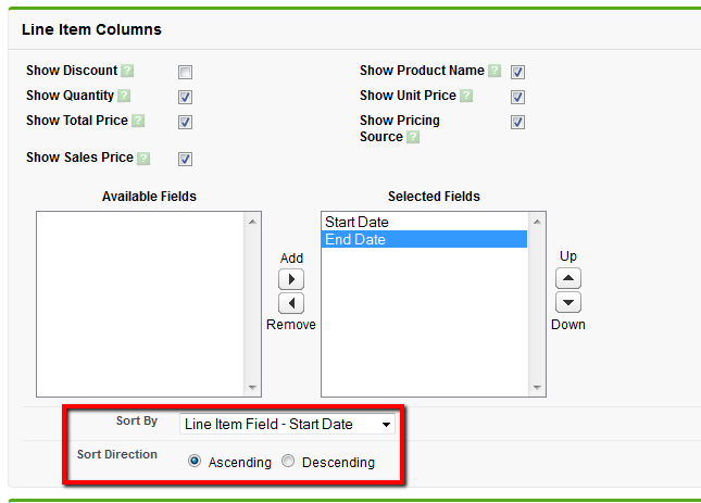 NOTE: Configuration Line Item fields must be moved to the Selected Fields section in order to be available for sorting. If the Sort By selection equals Default, then Ascending and Descending options do not apply.