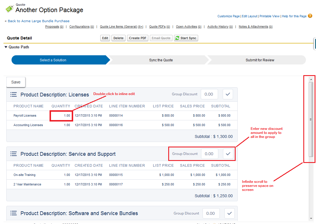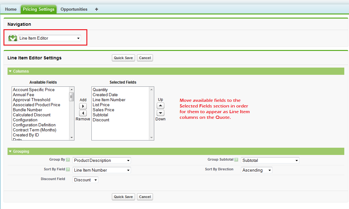 Administrators can establish a default sort order, grouping, and/or discount field to determine how all Line Items on a quote will appear for the sales user.