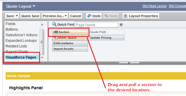 - From the Visualforce Pages category, select a Section and drag it to the location you want it to appear.