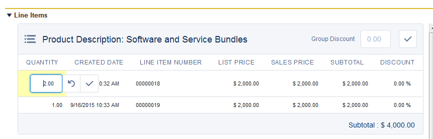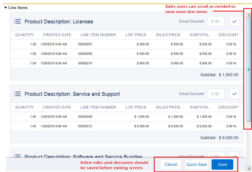 - Sales reps can quickly apply a discount to an entire group of line items in one quick step directly from the list of line items.