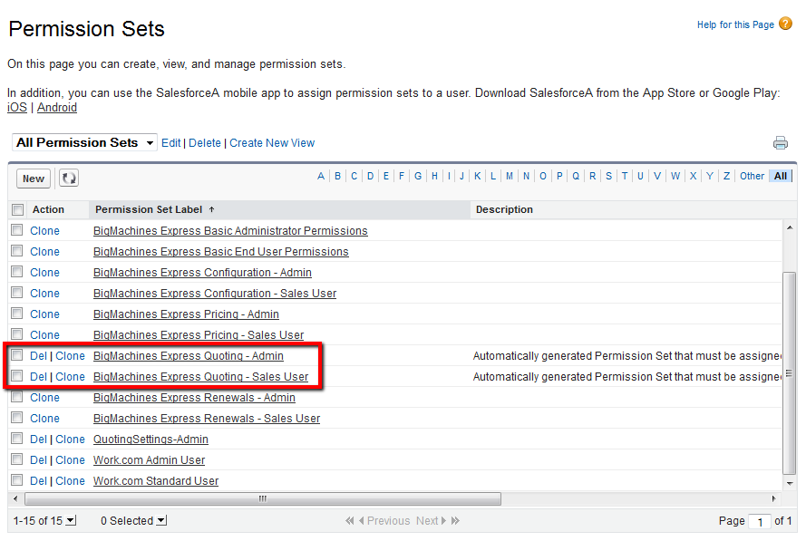 - The new permission sets will appear in the Permission Sets page (Setup > Manage Users > Permission Sets). Two sets are created:
