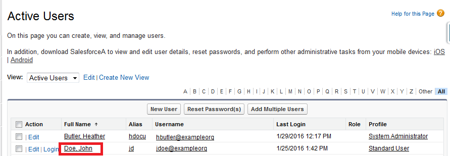 - Navigate to the Active Users page (Setup > Manage Users > Users).