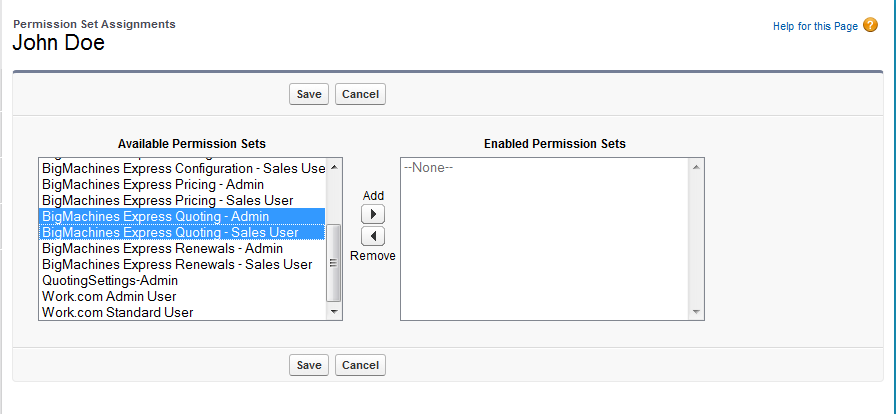 - From the Permission Set Assignments page, select the Permission Set(s) you wish to assign (i.e., BigMachines Express - Admin or Big Machines Express - User).
