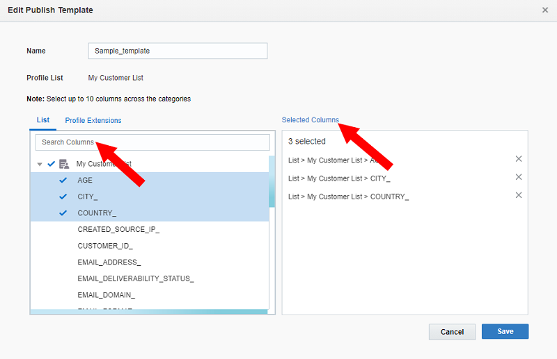 - A new Selected Columns pane on the dialog enables you to see all of the attributes you have selected. Before the change, you had to navigate between the List and the Profile Extension tabs to see all of the selected attributes.
