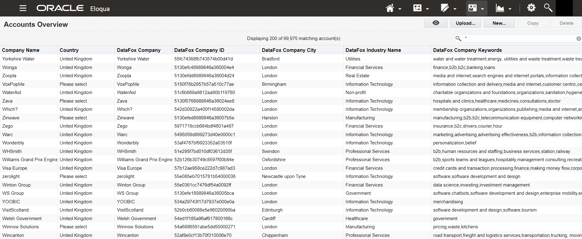 You can now enrich your accounts in Oracle Eloqua with company data and account scores from Oracle DataFox. Use the enriched data from this integration to enhance your sales and marketing decisions. For example, you can improve your understanding of customer fit, prioritize quality leads, and personalize outreach. Enriching accounts is an alternative to the existing option of enriching contacts.
