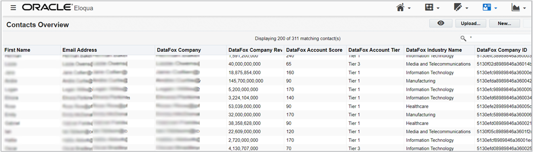 You can now integrate Oracle Eloqua with Oracle DataFox to enrich your contacts with account-level data and account scores. Use Oracle DataFox data to enhance your sales and marketing decisions in Oracle Eloqua. With enriched company-level data and account scores on contacts, you can improve your understanding of customer fit, prioritize quality leads, and personalize outreach. Use company data to enable and support Account Based Marketing strategies.