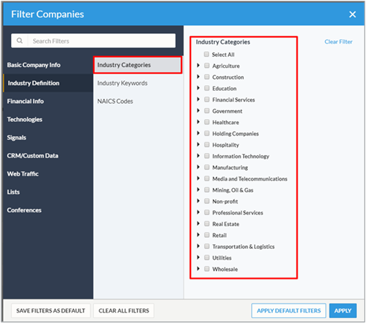 You can now filter companies based on industry categories. This enhancement helps you expand your total addressable market and screen a sector. To do so, from your Oracle DataFox account, navigate to the Companies tab, click the Add a Filter button, and click Industry Definition from the Filter Companies dialog box.