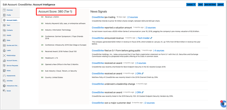 Monitor news on prospects with the Smart Talking Points feature in Oracle Engagement Cloud. Use news signals to have relevant business discussions and identify potential opportunities. Use account scores to understand if accounts are a good fit for your business, based on how closely they match your ideal customer profile.