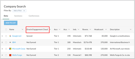 Know if your account is synced or not synced to Oracle Engagement Cloud from the Oracle Engagement Cloud column on the Company Search page.