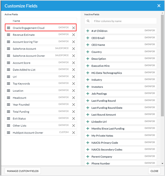 - In the Inactive Fields section, click the + icon against the Oracle Engagement Cloud field to move it to the Active Fields section.
