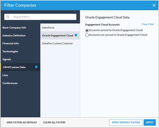 You can choose to view only accounts that are synced or those that aren't synced to Oracle Engagement Cloud on the Company Search page. To do so, navigate to the Company Search page, click Add a Filter, and apply the Oracle Engagement Cloud field to the Company page.