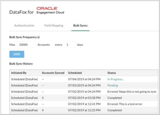 View the history of your account syncs on the Settings page for Oracle Engagement Cloud. You can view the total number of accounts synced, when and who initiated the sync, and status of the sync using this section. Previously, you could only set the bulk sync frequency for your accounts on this page.