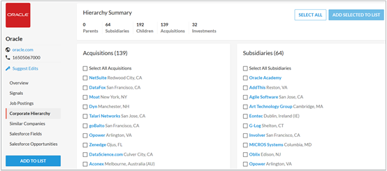 This screenshot shows the hierarchy summary for Oracle, including locations.