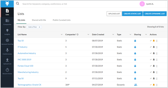 The Dashboard tab is now removed from the navigation menu. You are now directed to the Lists page or Companies page to help you get started quickly. Here’s what you see when you sign in: