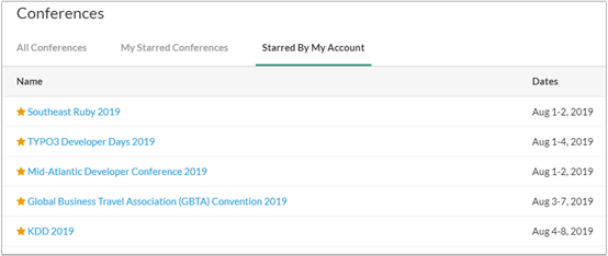 You can now view the My Starred Conferences and Starred By My Account tabs on the Conferences page. Previously, these tabs were displayed on the Dashboard page after a conference was starred on the Conferences page. With this update, you can view all the conference-related information on the same page.