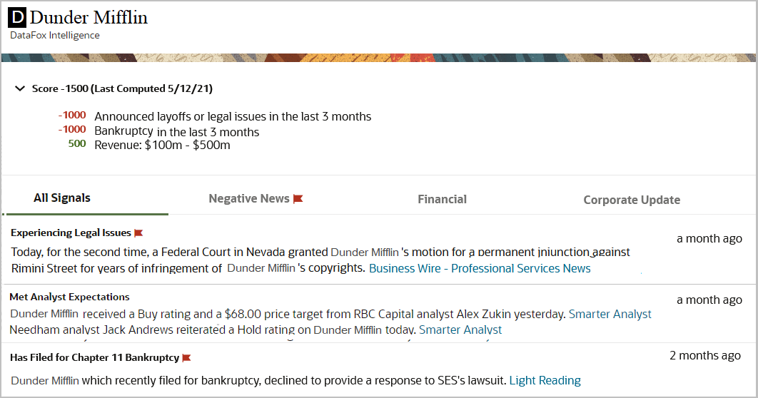 You can use the real-time scores, signals, and alerts to assess risks during onboarding and ongoing supplier profile management. This screenshot shows the DataFox signals for a supplier in Procurement Cloud.