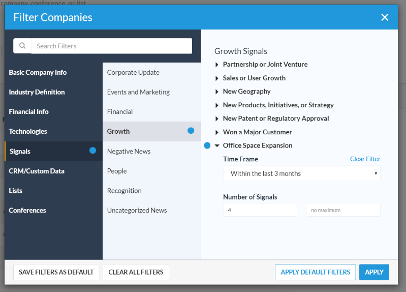 You can now sync DataFox company signals to Eloqua to create more targeted and personalized campaigns. In DataFox, add filters and create a dynamic list with the signals that you want to sync to Eloqua.