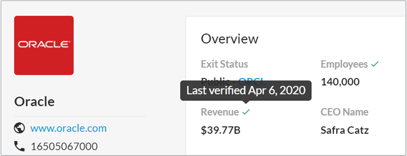 You can now easily gauge the revenue value for a company. If the revenue for a company is exact and is verified, you now see a Verified icon next to the Revenue field on the Company Overview page. Hover over the field to see the date when the revenue was last verified. For companies with an estimated revenue, you see est in the Revenue field.