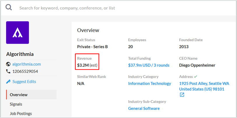 This screenshot shows estimated revenue for a company on the Company Overview page.