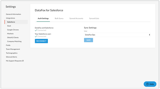 To view the Bulk Syncs, Synced Accounts, and Synced List tabs in the Settings page, you must connect your Salesforce account to Oracle DataFox.