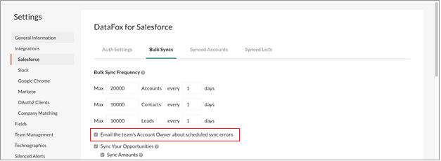 Email the account owner on the resync errors by selecting the Email the team's Account Owner about scheduled sync errors check box in the Bulk Syncs tab from the Settings page. The check box was earlier labeled as Email me about resync errors.