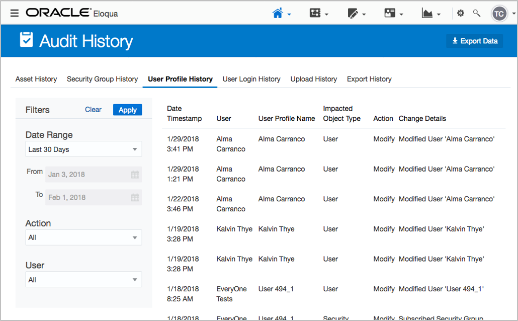 - Eloqua Data upload and Data Export Audit report.