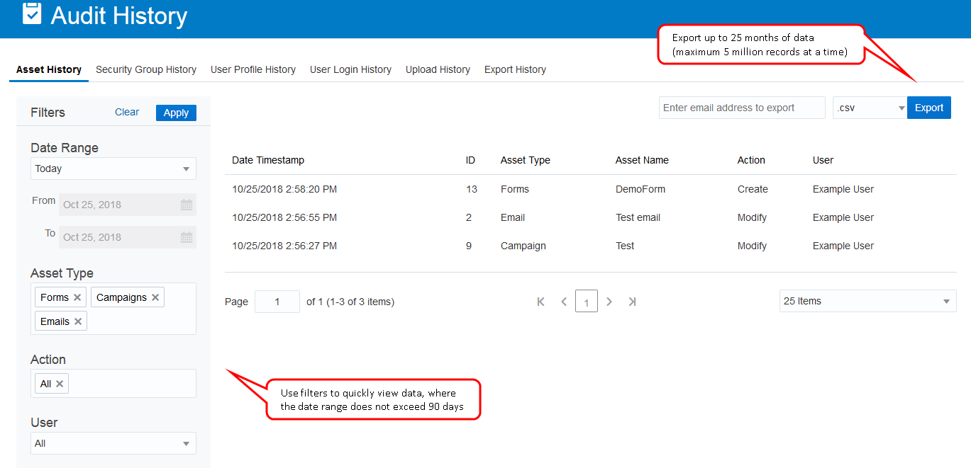 When exporting data from the audit log, filters can now be used to narrow your results.