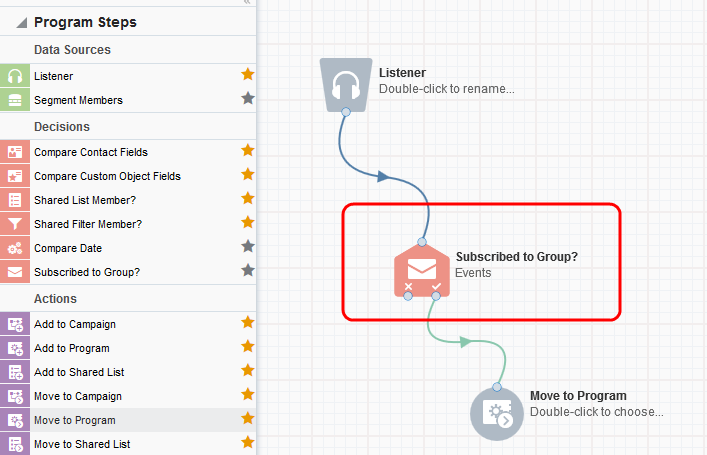 A new Subscribed to Group decision step is available on the program canvas. Use this step to evaluate and route contacts based on whether they are subscribed to an email group. Learn more