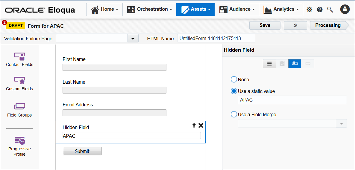 We have made additional changes to integrate the features of the soon to be deprecated Form Pre-population app into Oracle Eloqua. Picklist values can now be pre-populated using field merge values. Review the product notice and forms documentation for additional information about the changes.