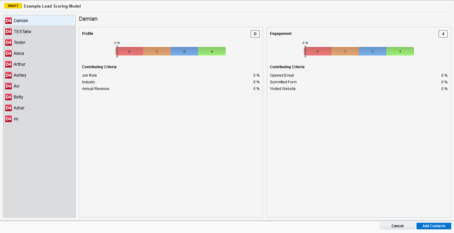 While inside a lead scoring model, you can preview the lead score for up to 10 contacts. Learn more