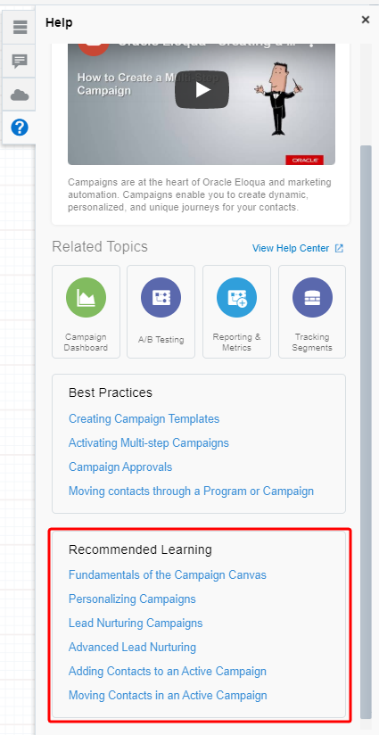 Recommended Oracle University courses are now shown in the Help Panels for campaign canvas, email, landing page, and form Design Editors in the Recommended Learning sections.
