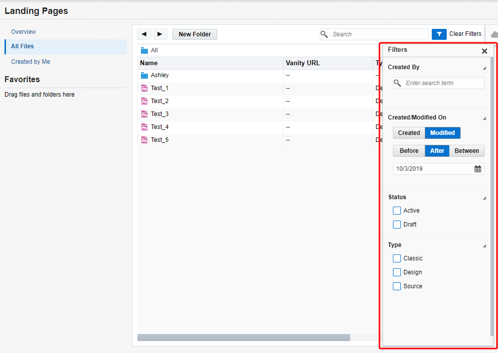 Filter by vanity URL: You can now search for landing pages by the landing page's vanity URL, also known as the relativePath. After 19D, using the search URL parameter with name will include matches for landing page name and relativePath.