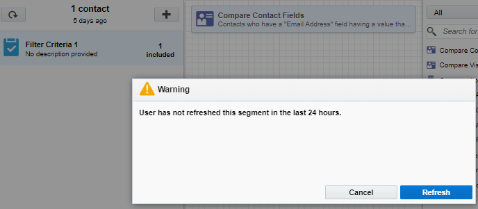When clicking View Contacts for a filter, a warning message displays if the segment hasn't been refreshed in the last 24 hours.