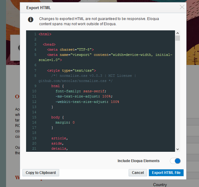 Exporting responsive HTML from the email and landing page Design Editors is now generally available. This feature was previously part of our controlled availability program. This enables you to share that content and utilize the output for other use cases, giving you greater flexibility while also having the benefit of the editor.